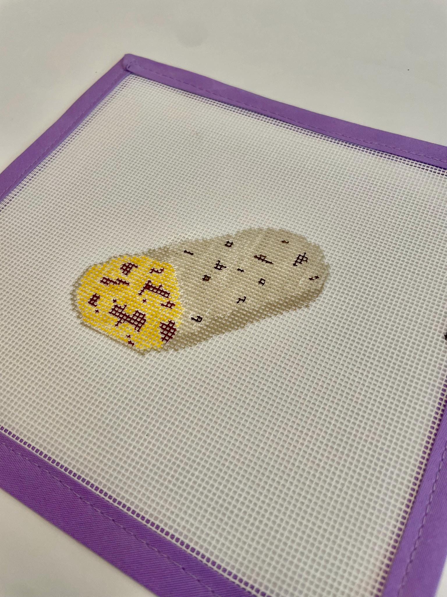 The Breakfast Taco Needlepoint Canvas from Frick Frack is a celebration of bold flavors and even bolder stitch energy. Featuring scrambled eggs, crispy bacon, potatoes, and cheese tucked inside a warm tortilla, this design captures the heart of every true Texan’s morning routine.