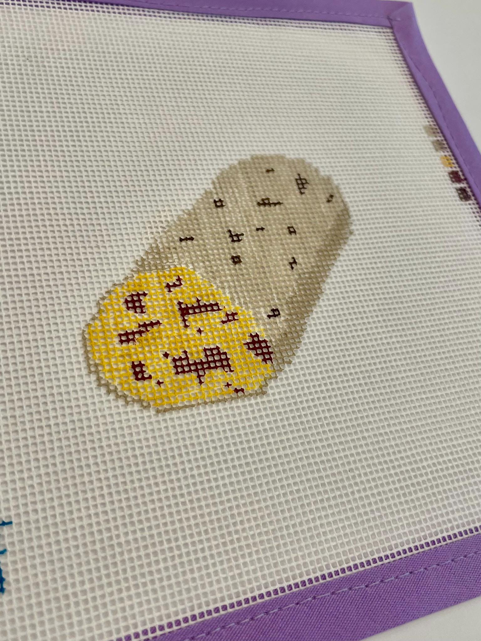 With sunny colors and cheeky charm, this hand-painted canvas brings personality to your stitching stash. It's perfect for gifting, finishing as a tray insert, or adding to your own kitchen gallery wall.