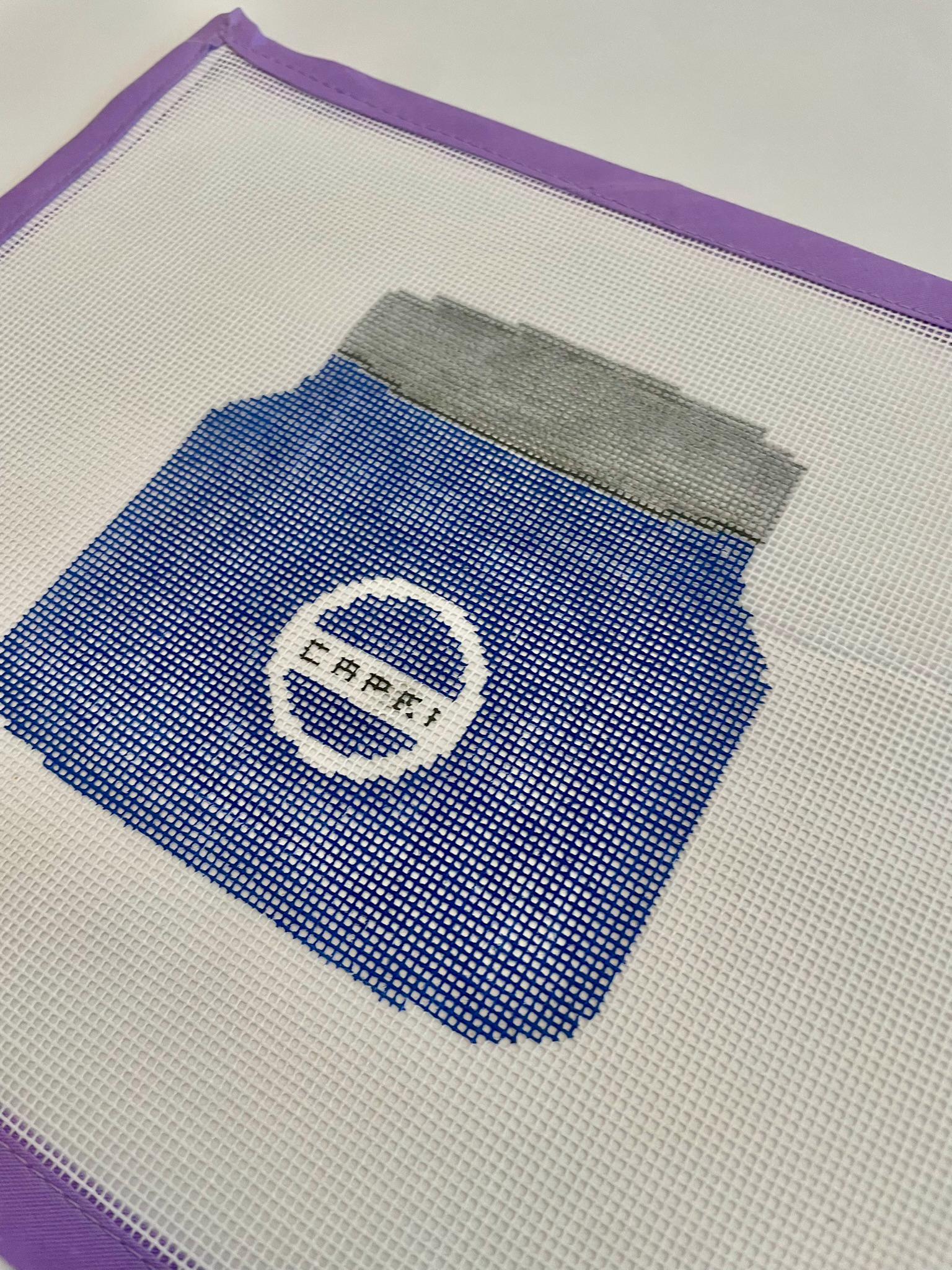 Bring a touch of iconic home fragrance style to your next stitching project with this hand-painted needlepoint canvas inspired by the beloved Capri Blue Volcano candle. Painted on 18 mesh mono canvas, this design captures the signature cobalt blue jar and bright, cheerful label details.