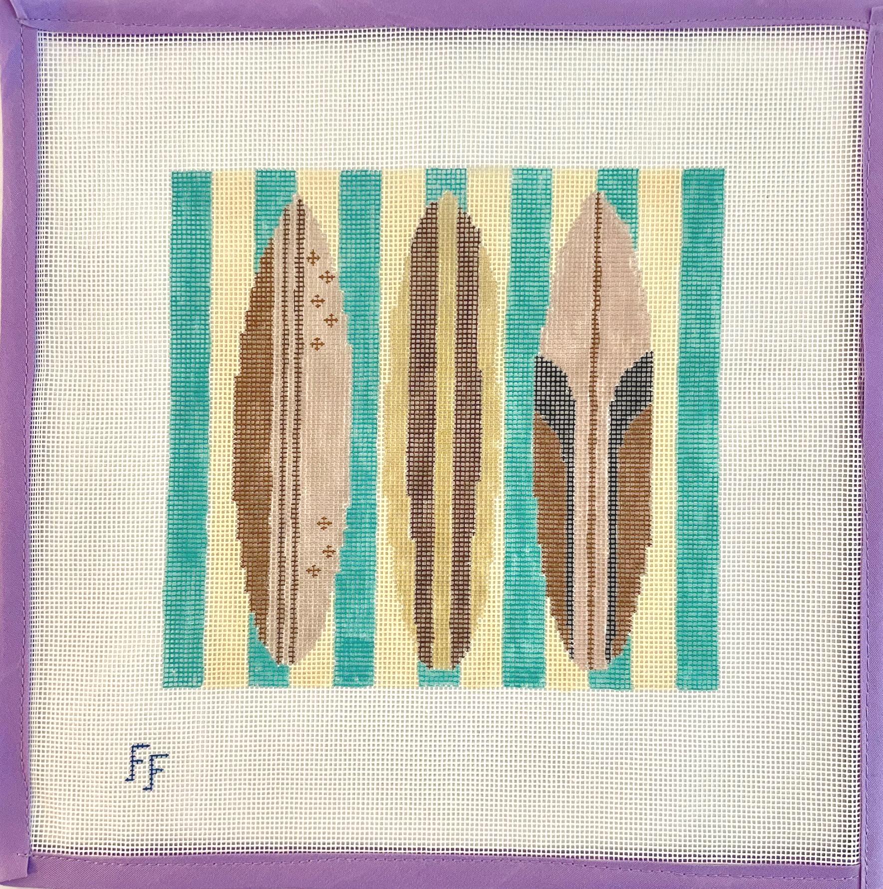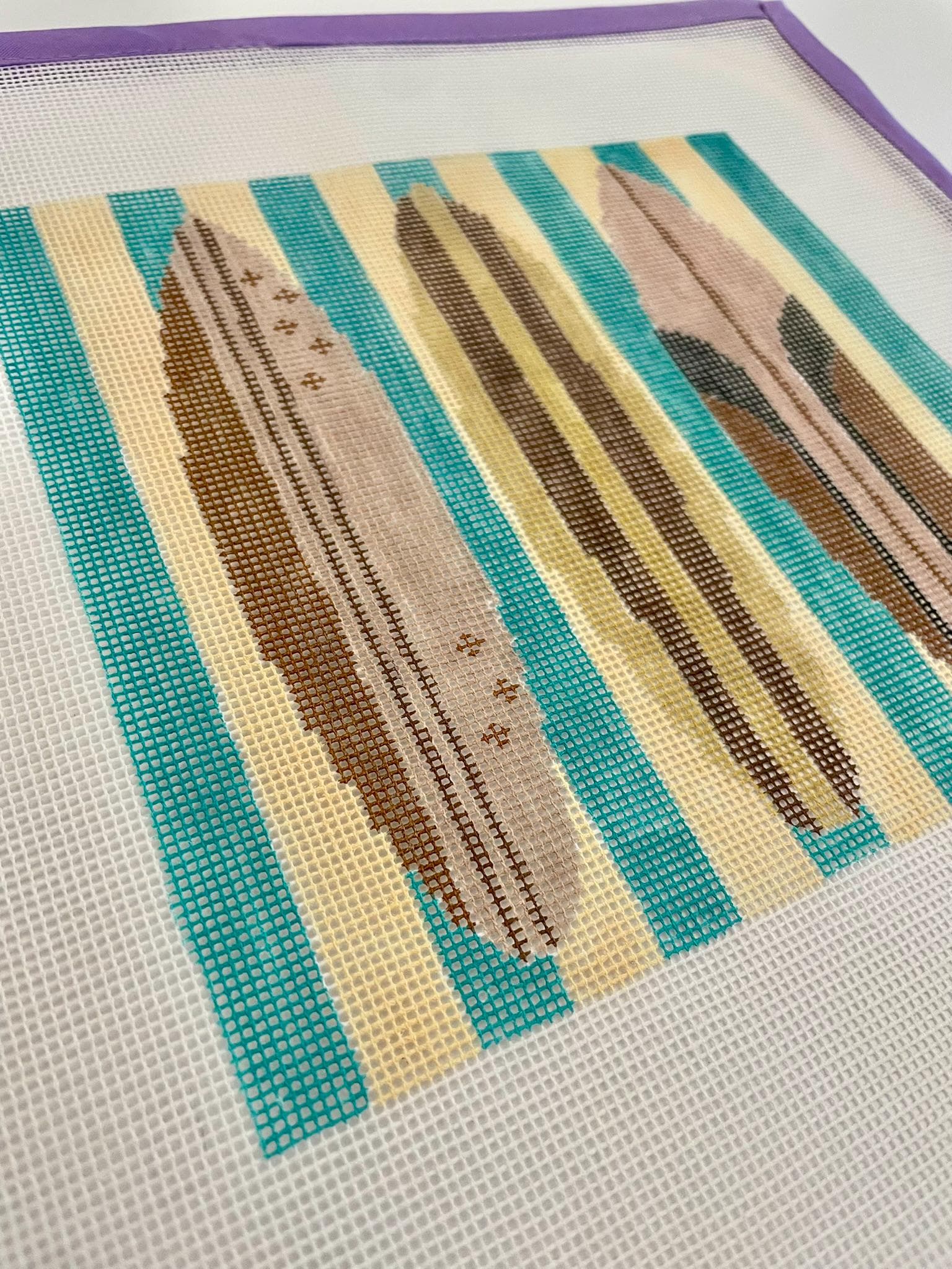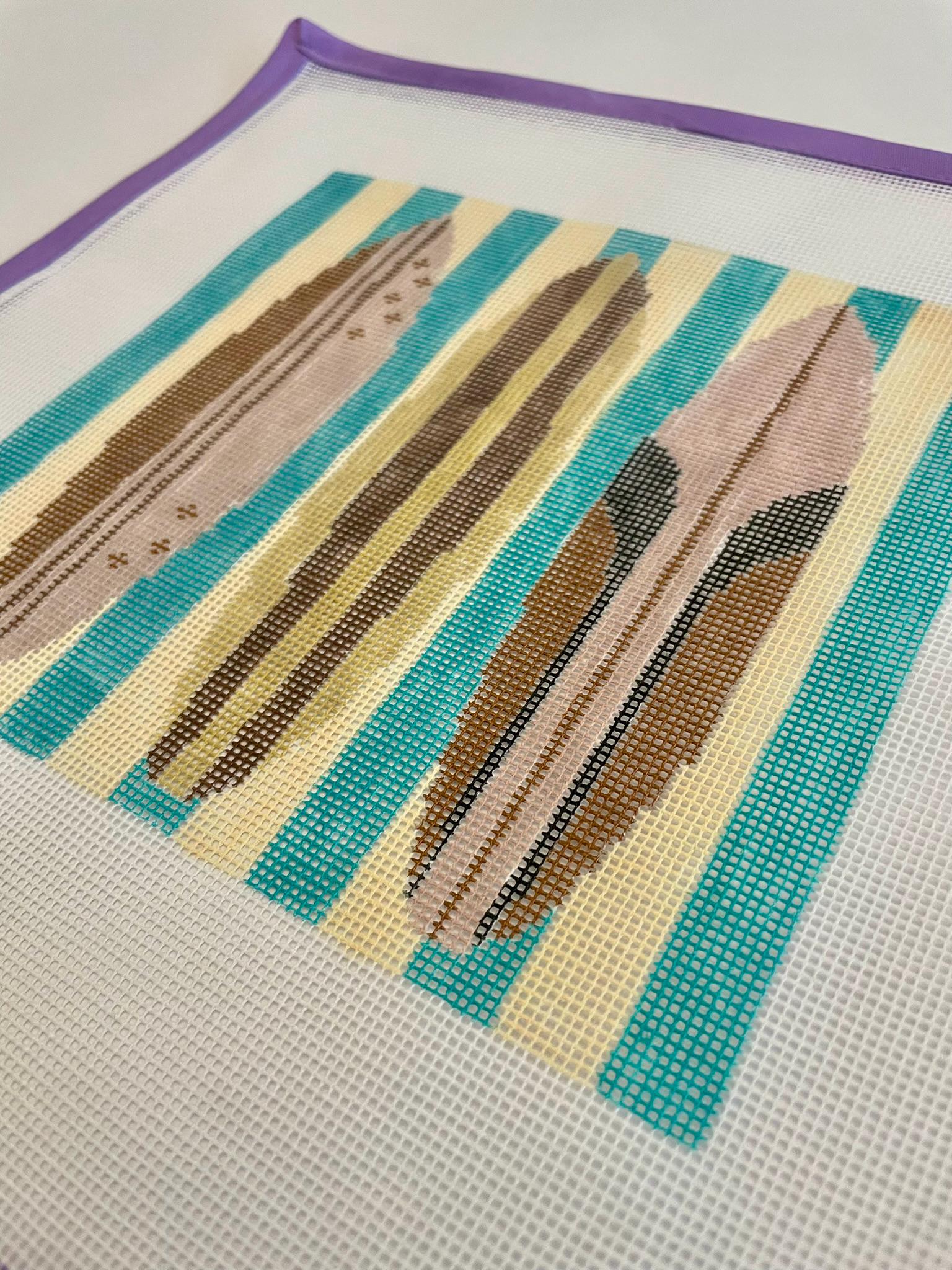 Ride the waves from your own stitching space with this hand-painted needlepoint canvas featuring three surfboards against a modern teal striped background. Sized at 6.5 by 6 inches on 18 mesh, it’s perfect for a fun wall accent, pillow, or tray insert that brings beachy vibes to any room.