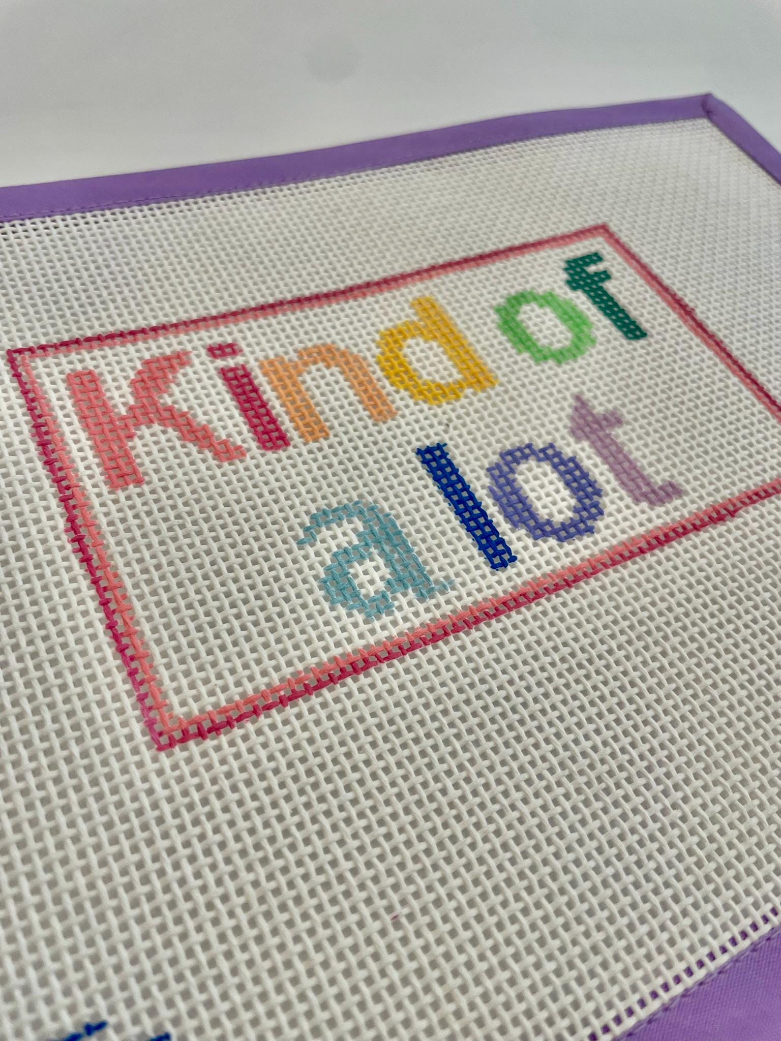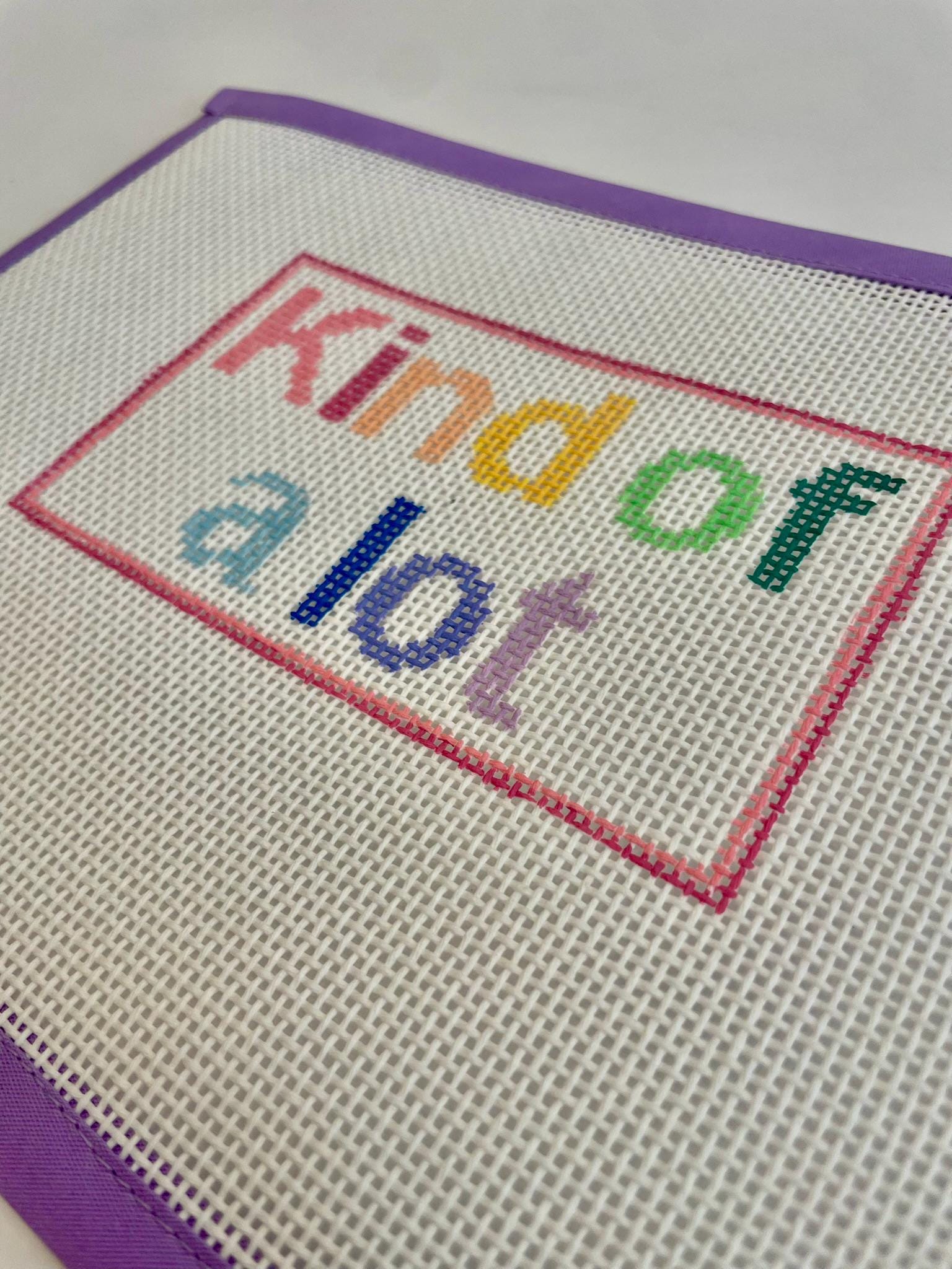 Make a statement with this hand-painted needlepoint canvas featuring the playful phrase “Kind of a Lot” in a bright rainbow font. Sized at 5 by 3 inches on 13 mesh, it’s perfect for a small wall hanging, tray insert, or quirky accent that adds color and personality to any space.