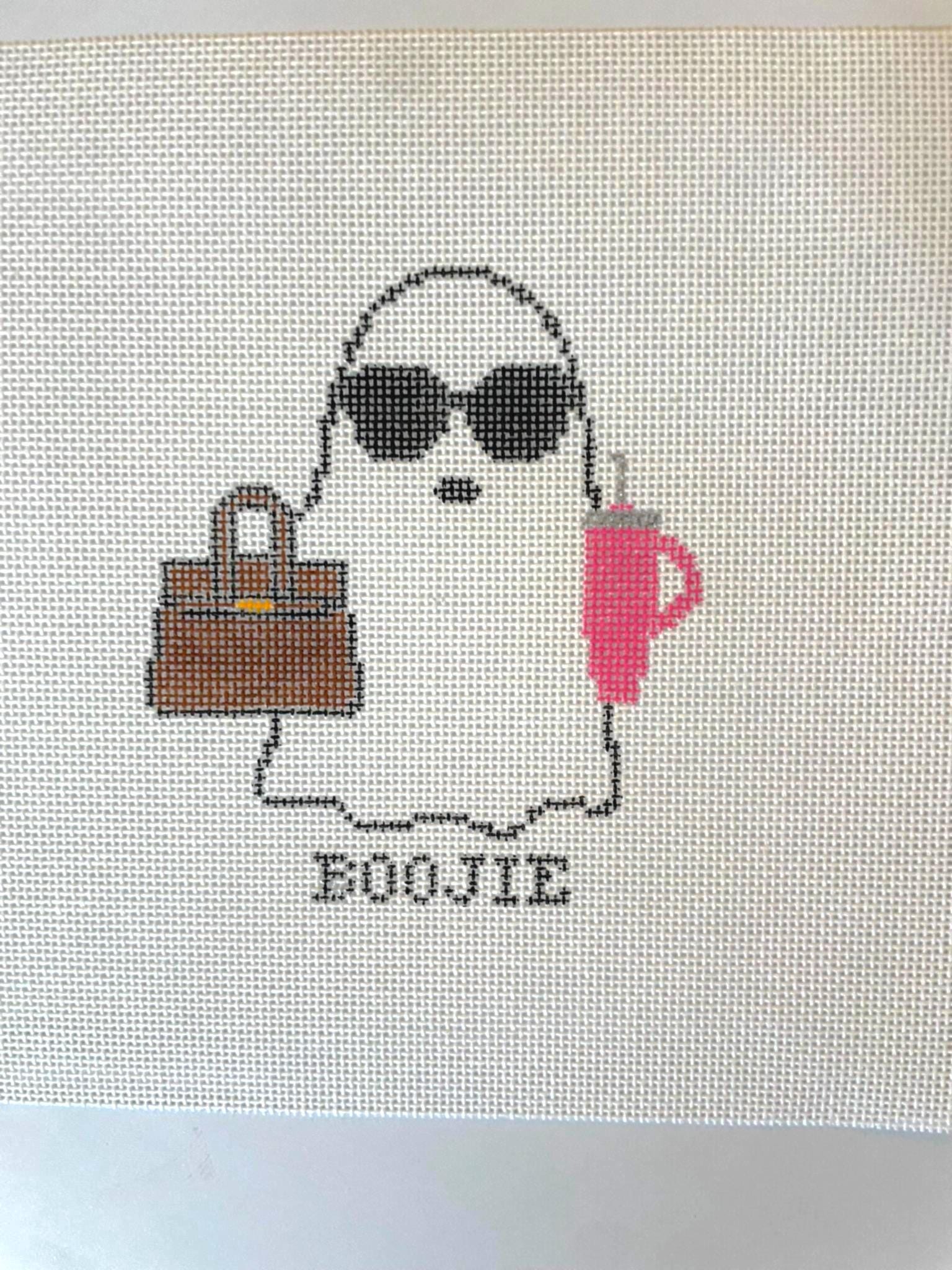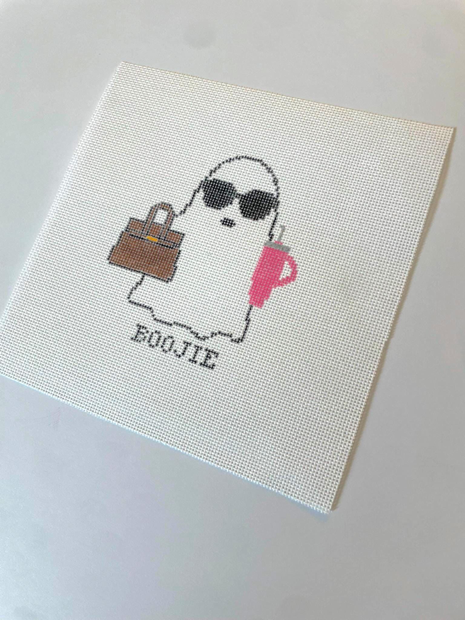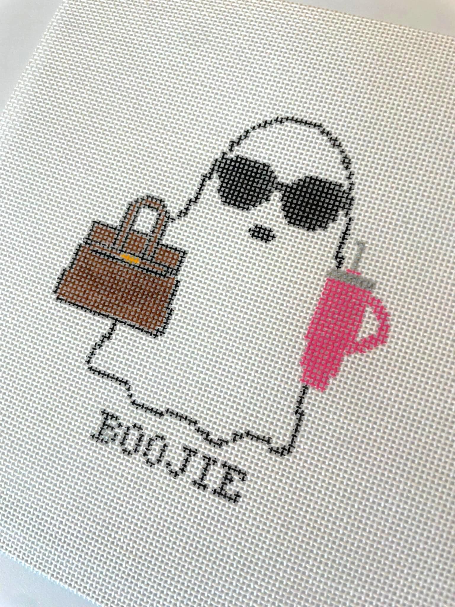 This hand-painted Halloween needlepoint canvas features a stylish ghost rocking oversized black sunglasses, carrying a luxe Birkin-inspired handbag, and sipping from her trendy Stanley water cup. A playful twist on spooky season, this modern ghost design makes stitching fun, fashionable, and festive.