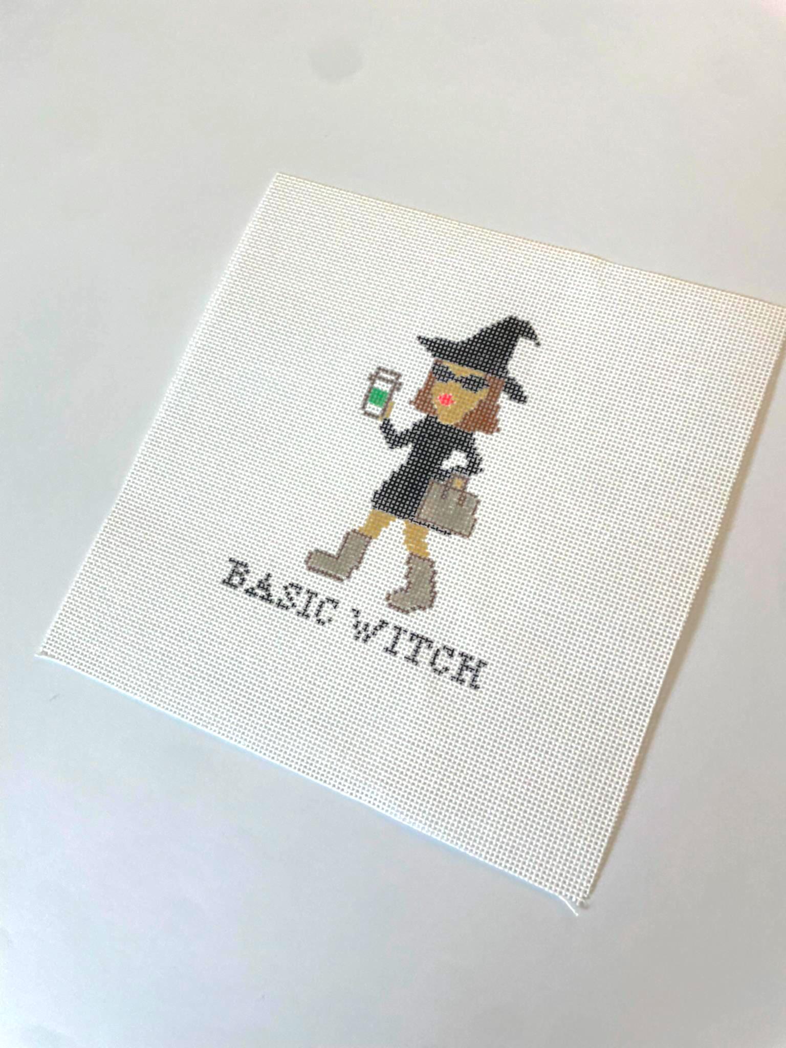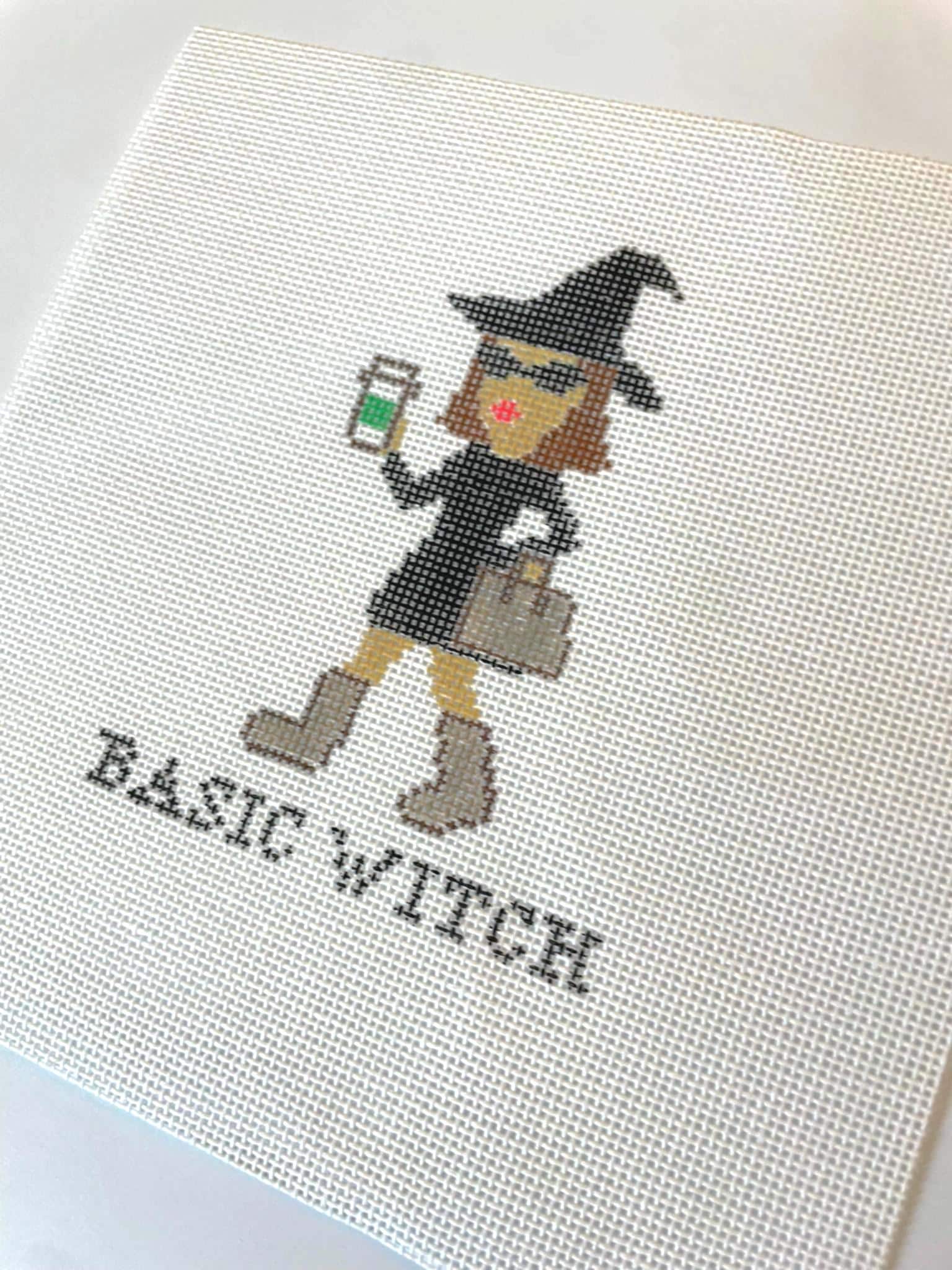 This hand-painted needlepoint canvas features a chic witch rocking her pointed hat, oversized sunglasses, cozy Ugg boots, a luxe Birkin-inspired purse, and (of course) a Starbucks coffee cup. A playful nod to every pumpkin spice lover, this design makes Halloween stitching stylish, fun, and a little boujee.