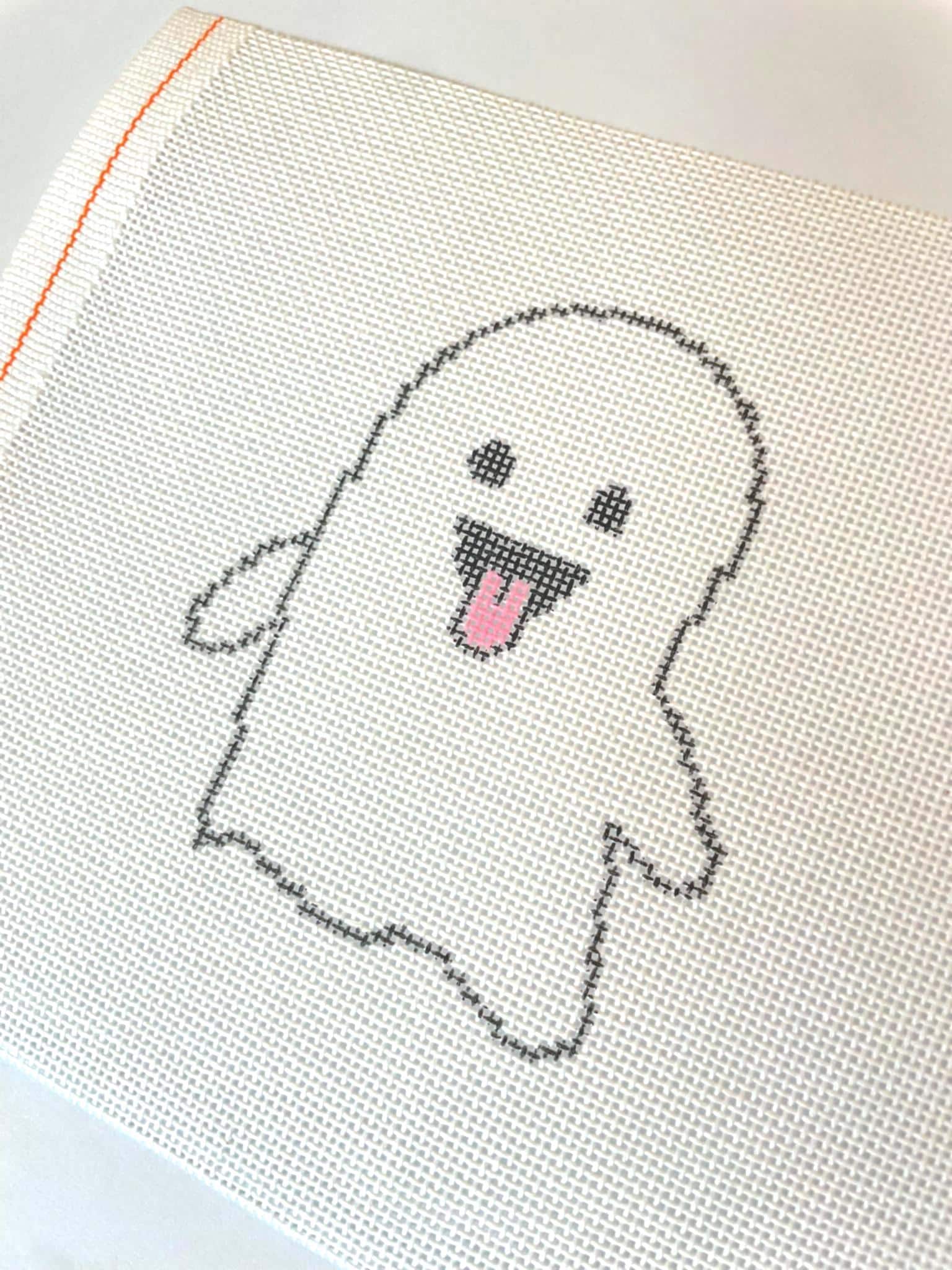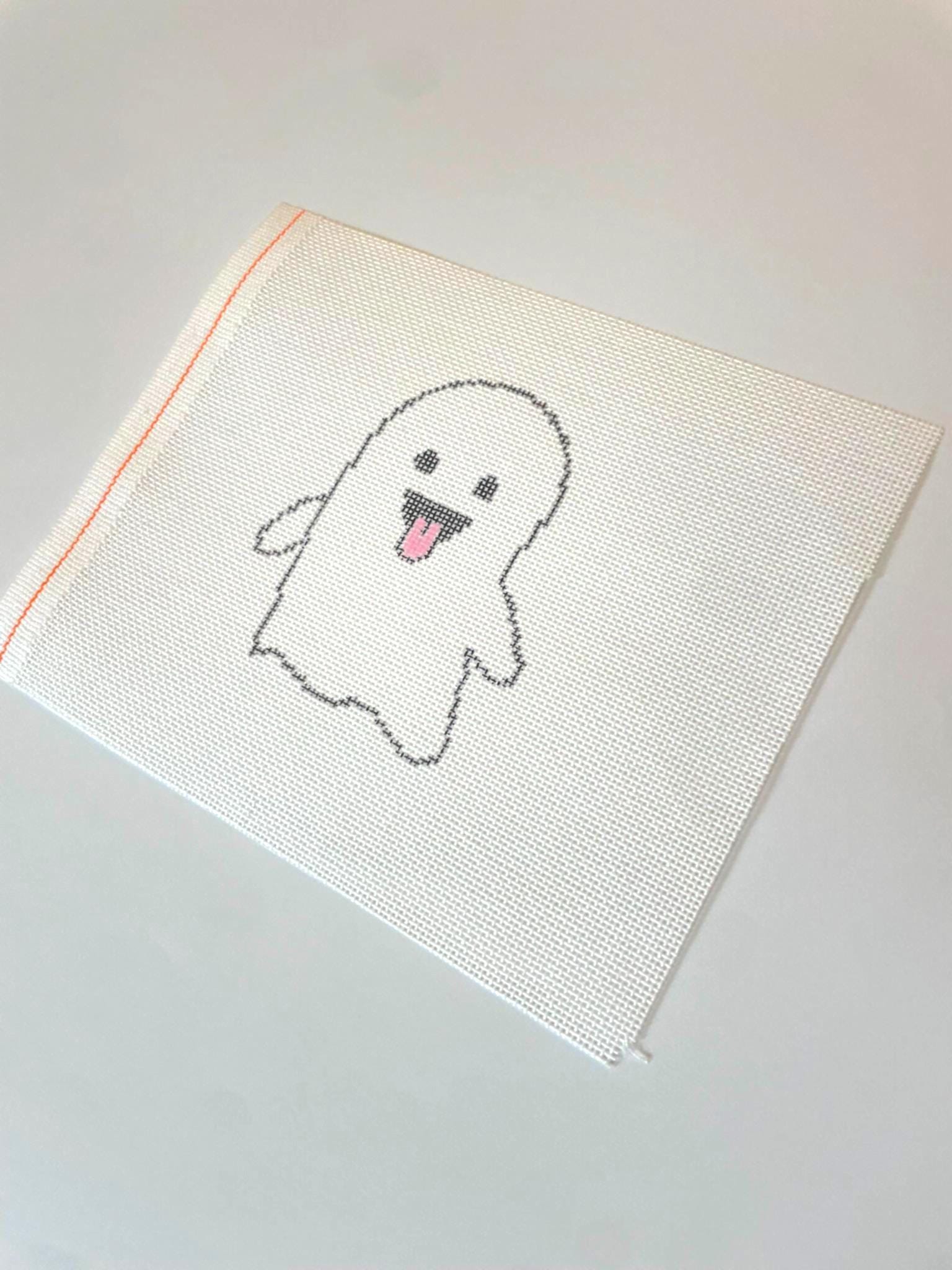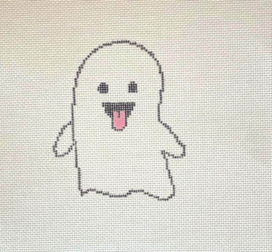 This hand-painted Halloween needlepoint canvas features a cute little ghost with tongue sticking out. Playful, funny, and never too scary, this design is a great choice for Halloween lovers who like their décor lighthearted and modern.